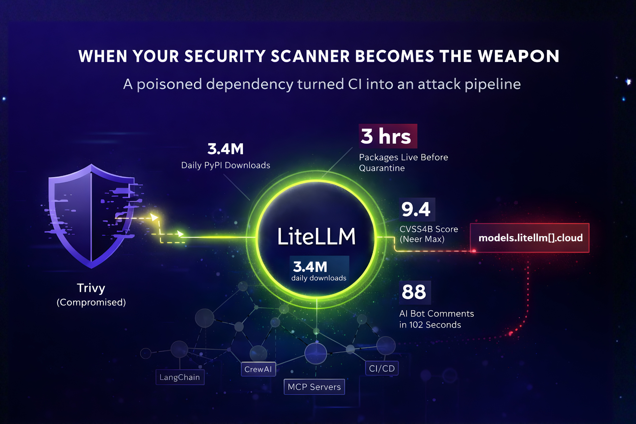 On March 24, 2026, a supply chain attack hit LiteLLM - one of the most widely used AI infrastructure libraries in the world, downloaded 3.4 million times every day. But this wasn't a typical attack. Threat actor TeamPCP compromised the very security scanning tool that LiteLLM used to protect itself, then used those stolen credentials to backdoor the library directly.